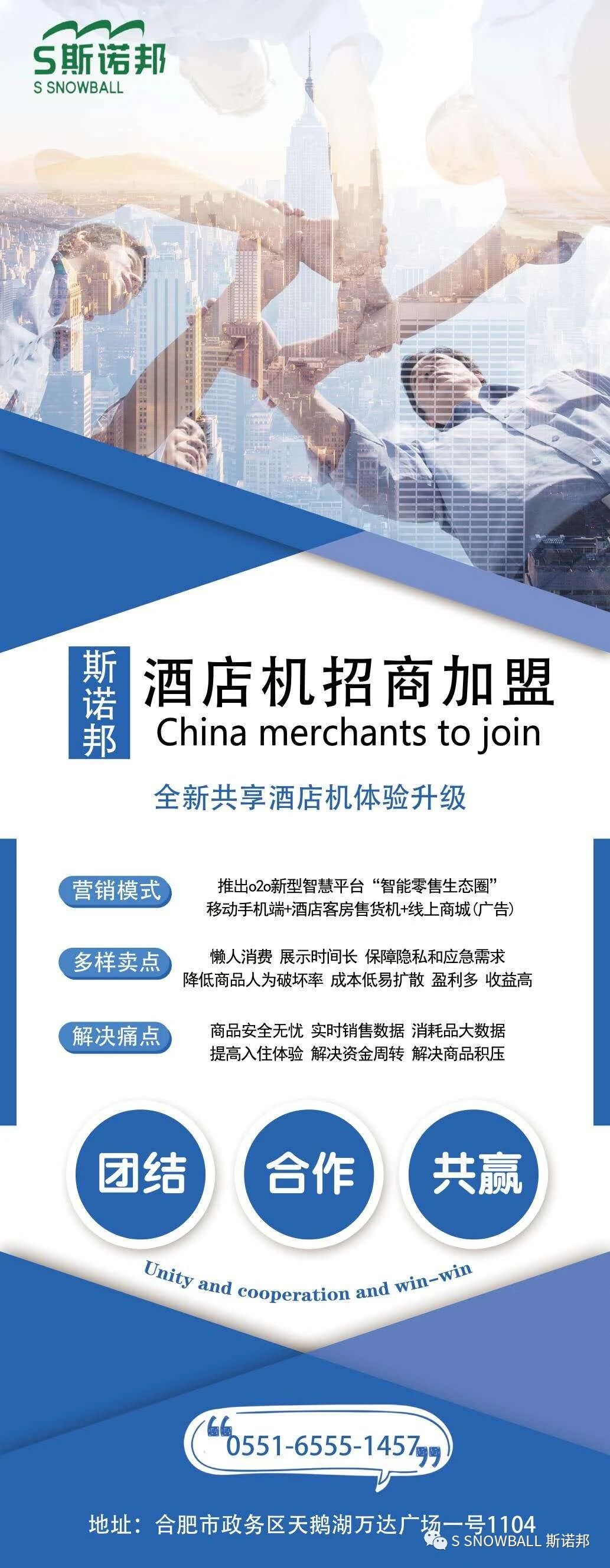 市场新垄断 斯 诺 邦共享酒店机是安徽瀚鸿网络科技有限公司的主要产品,我们的产品负责人是项先生,我们的地址是安徽省合肥市政务区天鹅湖万达广场一号写字楼,期待与您的合作!